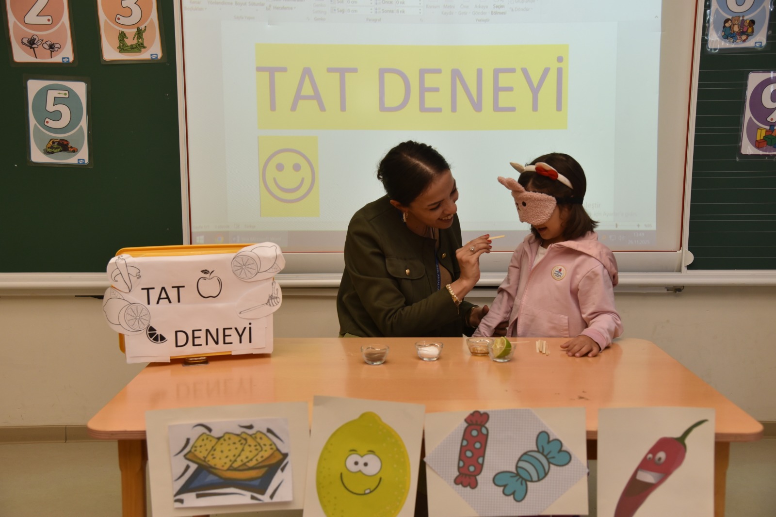 Özel Antalya Koleji Okulları Konyaaltı Kampüsü Okul Öncesi öğrencileri “tat deneyi” yaptı. Öğrenciler; ekşi, tatlı, tuzlu ve acı tatları tanıyarak hangi tatların hoşlarına gittiğini eğlenceli