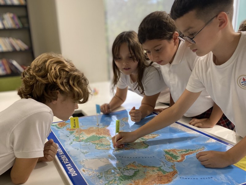 Özel Antalya Koleji Okulları Konyaaltı Kampüsü İlkokul 3. sınıf öğrencileri, İngilizce skills derslerinde dünya haritası üzerinden seçtikleri ülkelerin kültürleri ile ilgili çalışmalar yaptı.