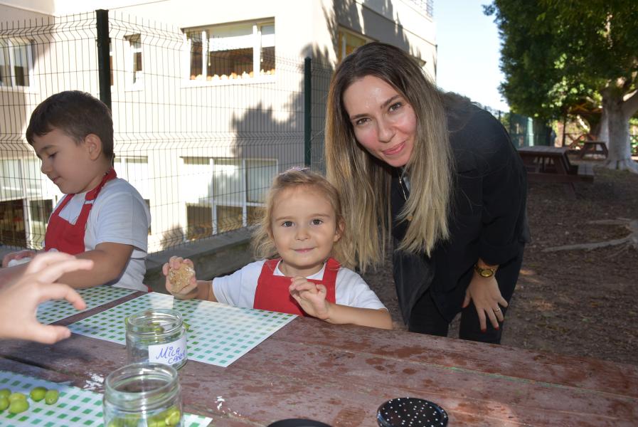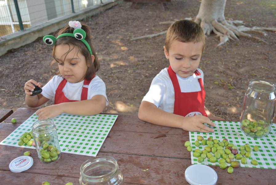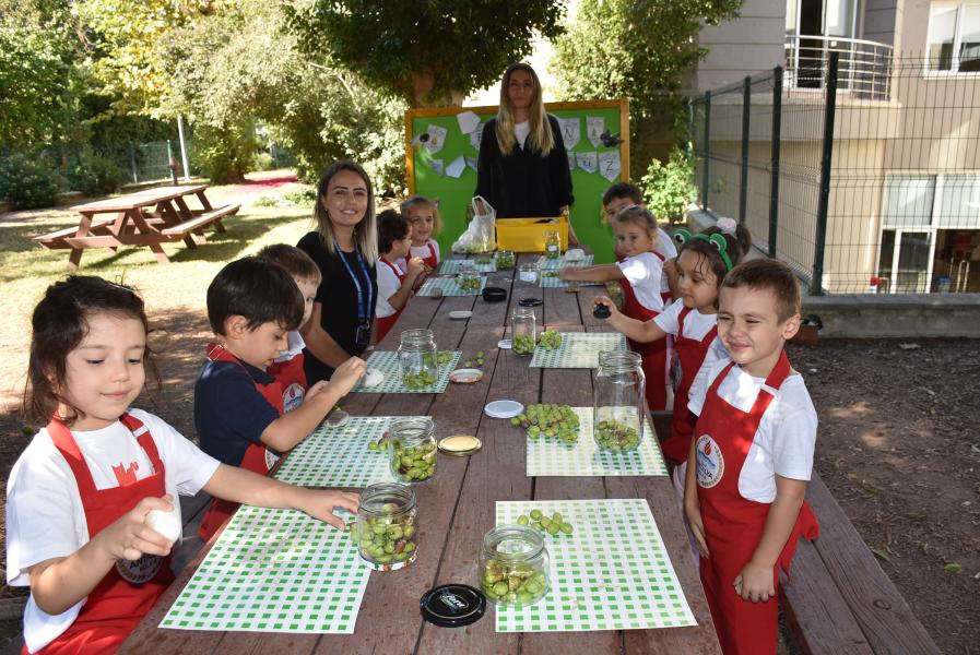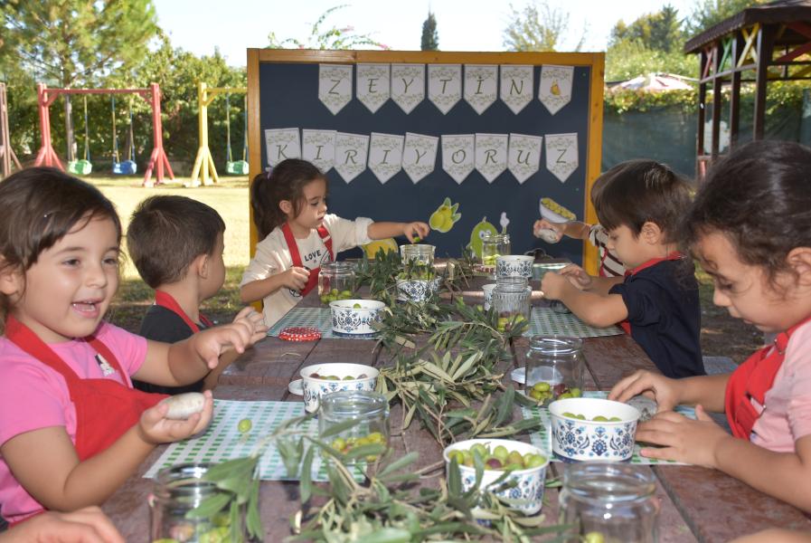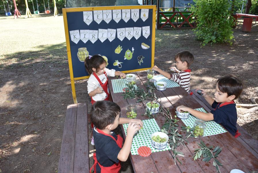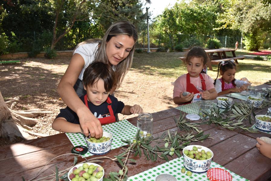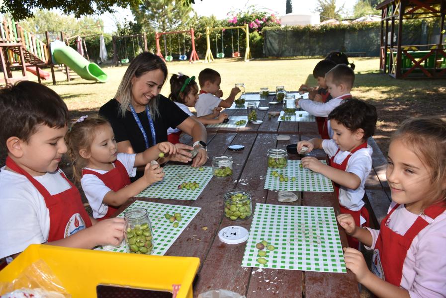 Aile katılımı ile kış hazırlıkları kapsamında zeytin kurmayı öğrenen 5 yaş grubu öğrencileri, zeytinleri taşla elde tek tek zarar vermeden kırarak kavanoza doldurdu.